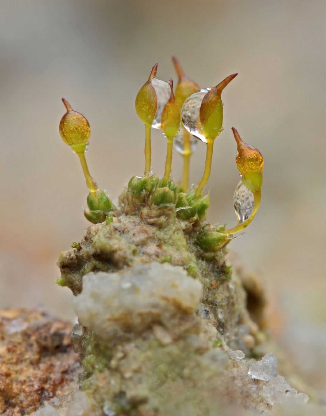 Lupenitka drobná (Pterygoneurum ovatum). Na lístcích i tobolkách mechů rostoucích v teplých a suchých oblastech se nad ránem srážejí kapičky rosy