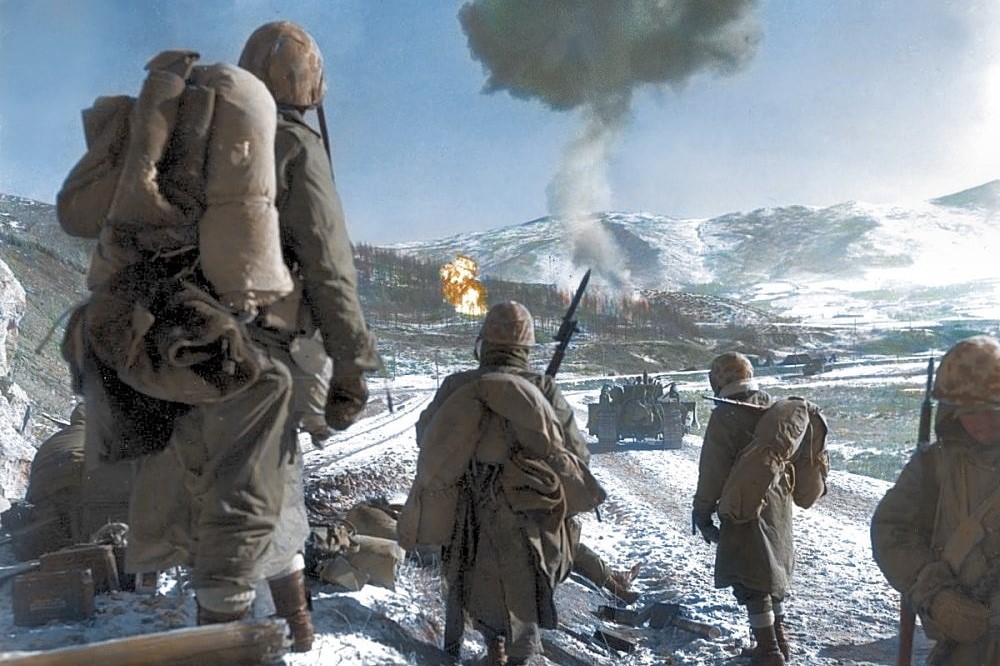 Příslušníci 1. divize námořní pěchoty sledují útok letounů F4U Corsair napalmem na čínské pozice v prosinci 1950. Součinnost letectva a pěchoty se po počátečních zmatcích podařilo zdokonalit. (foto: Profimedia)