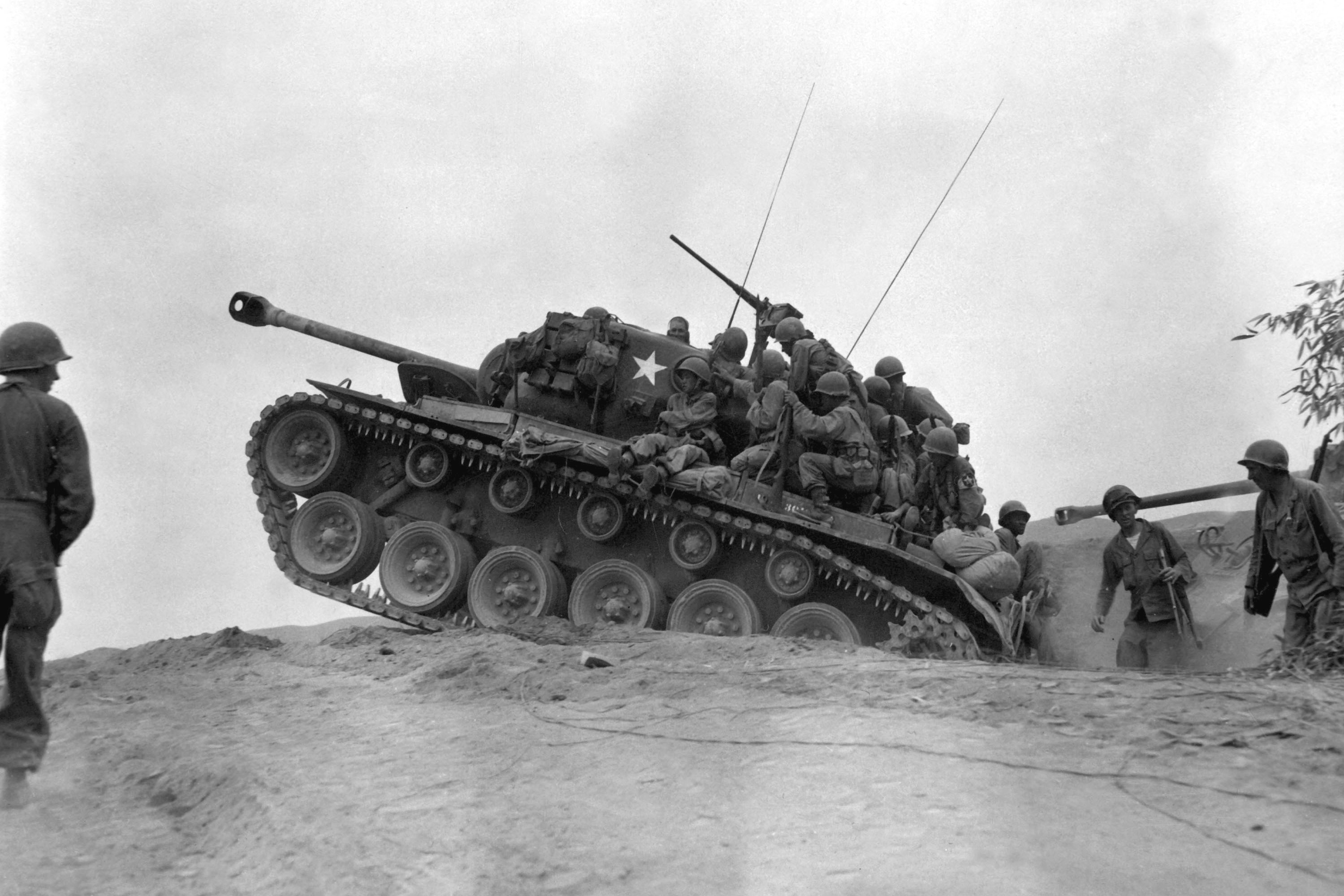 Příslušníci 9. pěšího pluku americké armády jedou na tanku M26 vstříc nepříteli, 3. září 1950. (foto: Wikimedia Commons, NARA, Thomas Marotta, CC0)