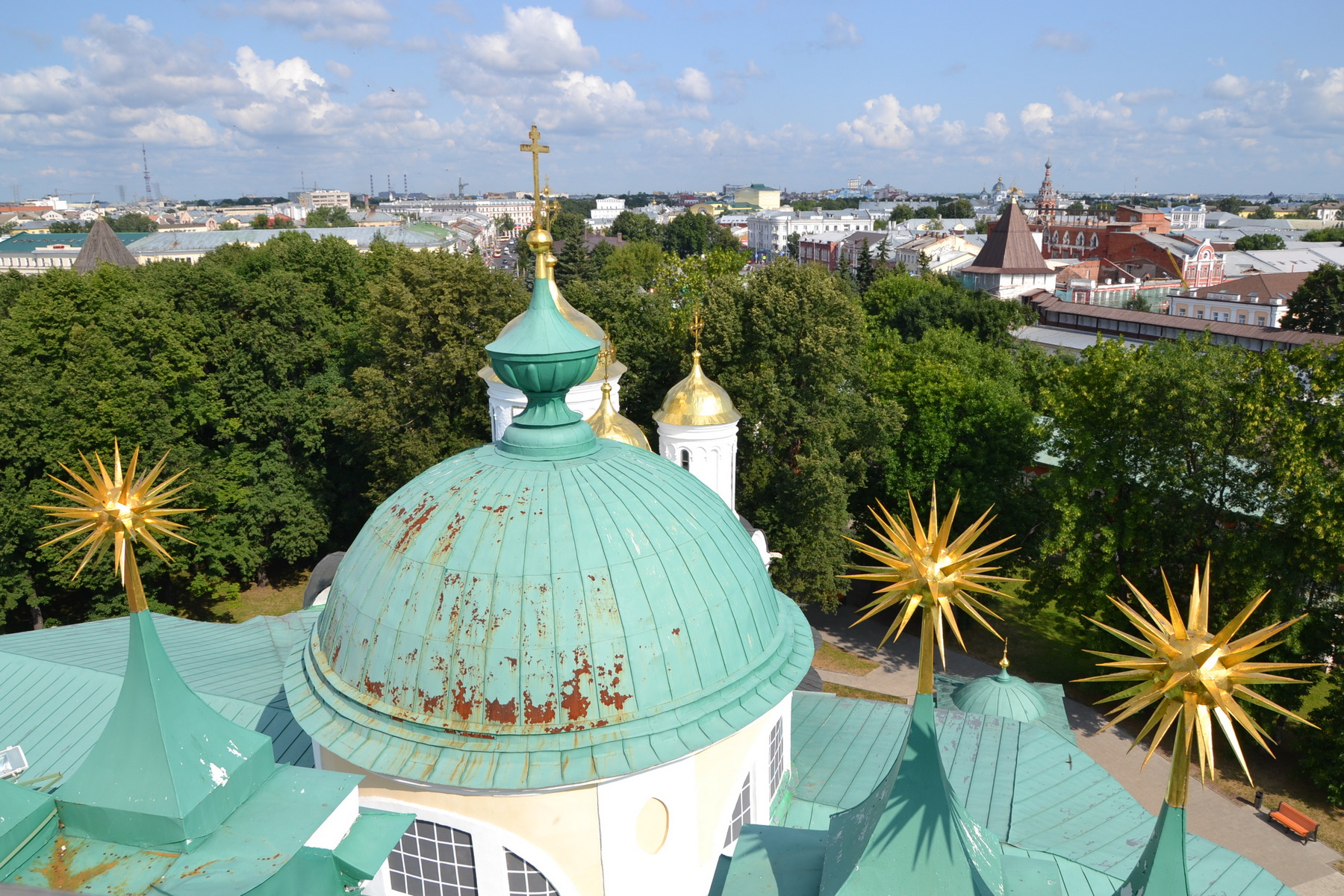 Z vrcholu starobylé zvonice v Jaroslavli se otevírá úchvatný výhled na město.