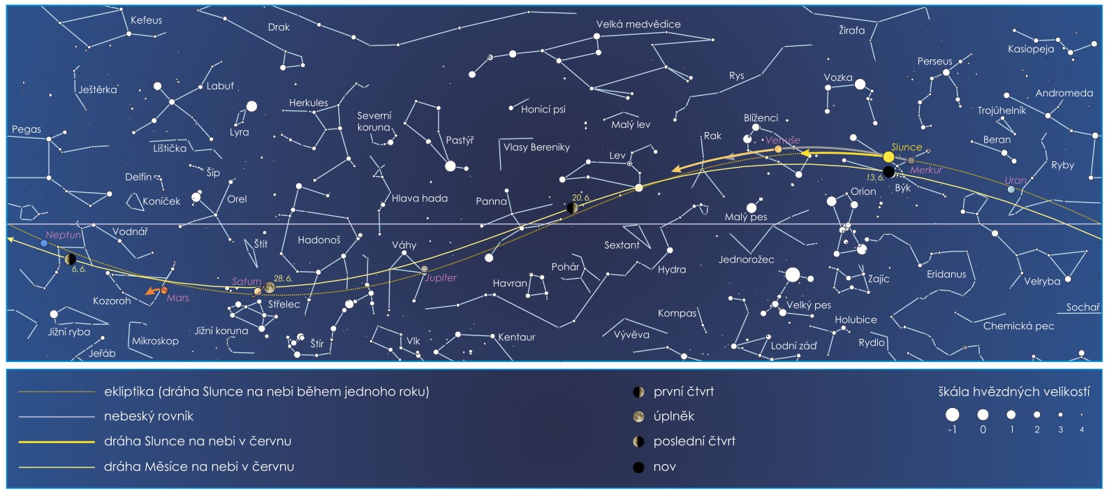 • Obdélníková mapa uvádí přibližné polohy významných těles Sluneční soustavy na červnovém nebi. U Měsíce jsou zvýrazněny pozice (včetně přesného data), ve kterých nastává první čtvrt, úplněk, poslední čtvrt a nov.