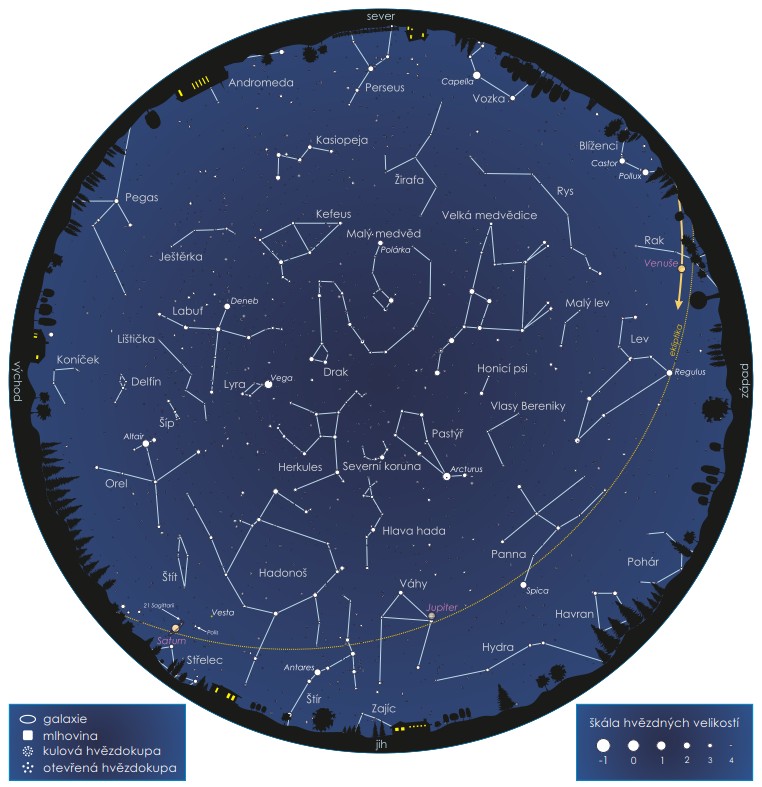 • Kruhová mapa zobrazuje podobu nočního nebe 15. června 2018 ve 23:00 středoevropského letního času (SELČ). Na počátku měsíce platí pro 00:00 SELČ, na konci pro 22:00 SELČ.