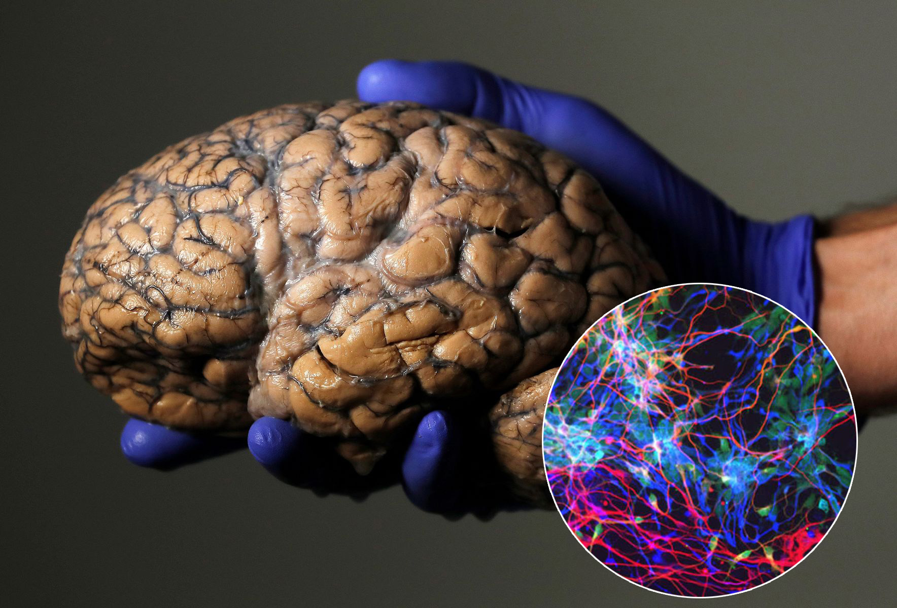 Lidský mozek je skutečně velký – váží mezi 1 300 a 1 400 gramy. Podle vědců za jeho velikost vděčíme genům NOTCH2NL. Ve výřezu buňky lidské mozkové kůry na Petriho misce v laboratoři.