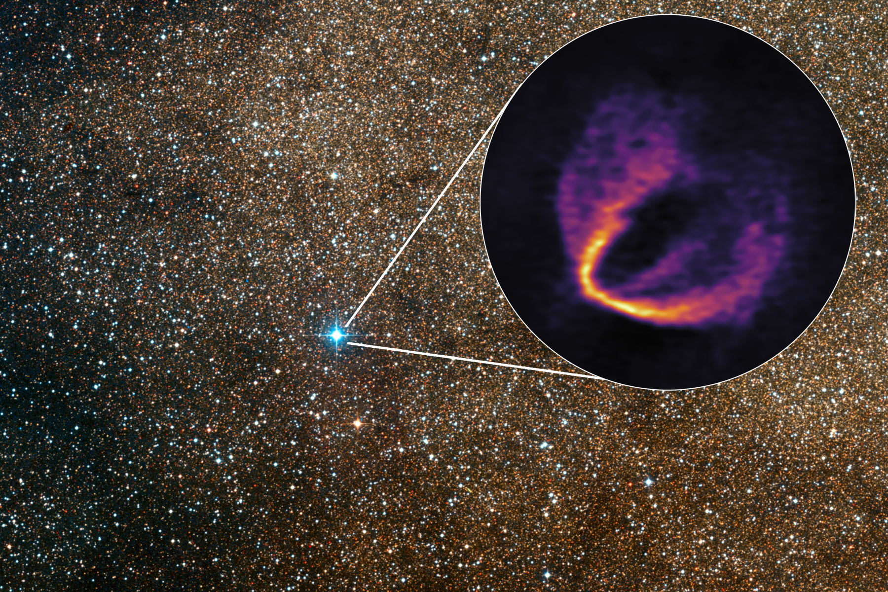 Okolí mladé hvězdy HD 163296. Snímek zobrazuje část dat pořízených pomocí ALMA na jedné vlnové délce a zachycuje podivnou smyčku hmoty (ve výřezu), která ukazuje na přítomnost jedné z planet.