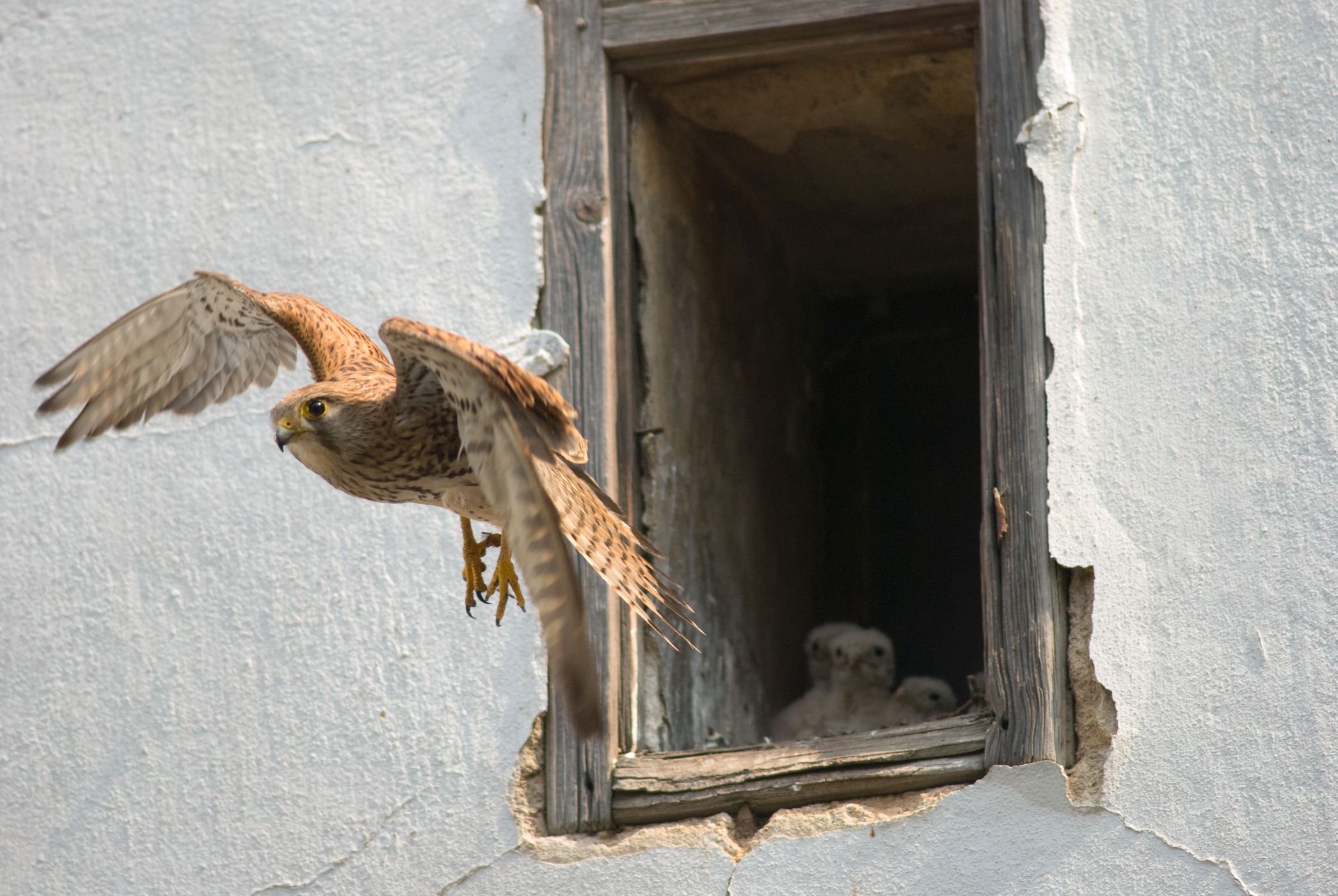 Samice poštolky odlétá od svých ještě ochmýřených mláďat pro další sousto