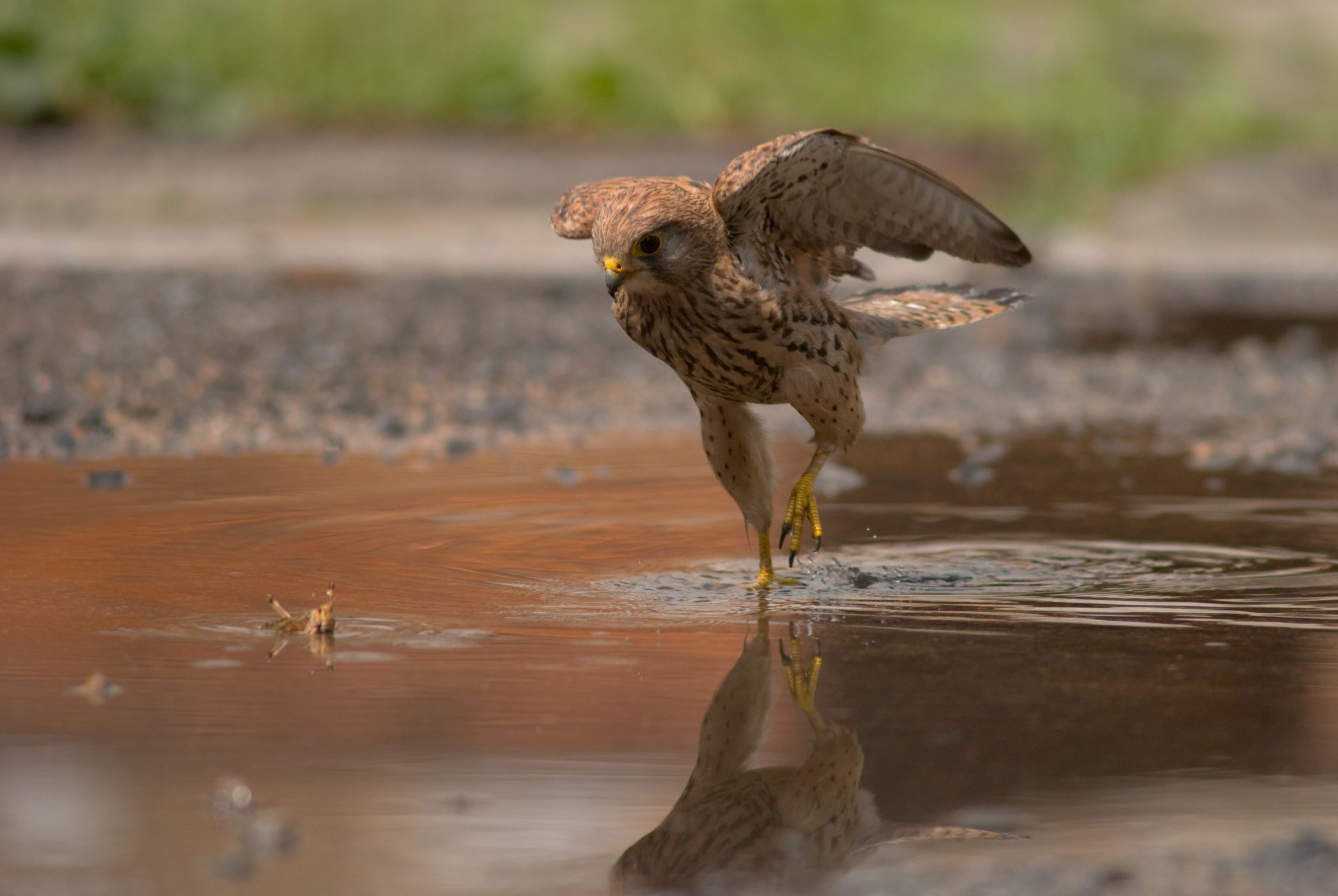 Váhavými kroky, jako čáp, si jde poštolka do kaluže pro saranče