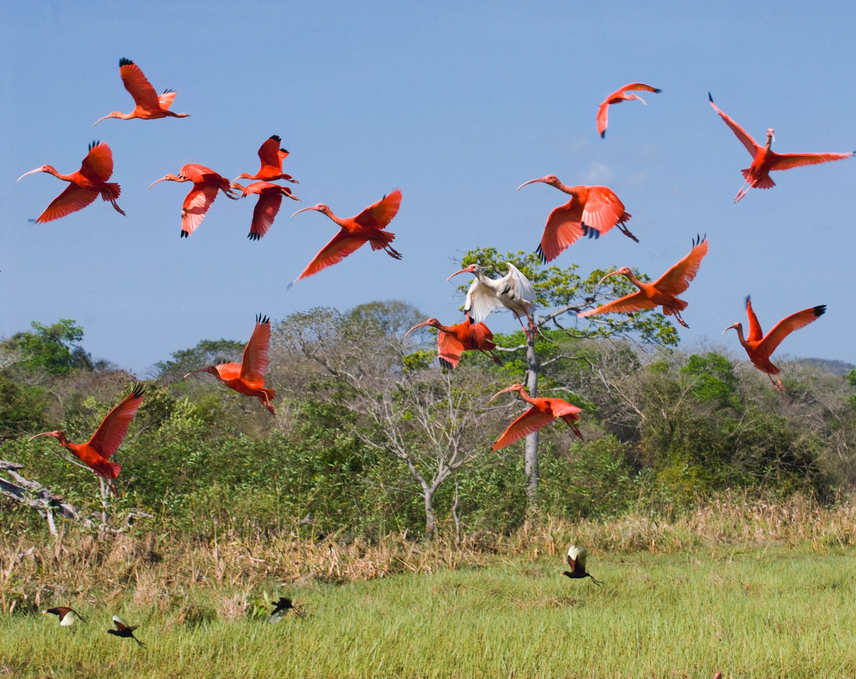 Výrazná barva ibisů je viditelná z velké vzdálenosti