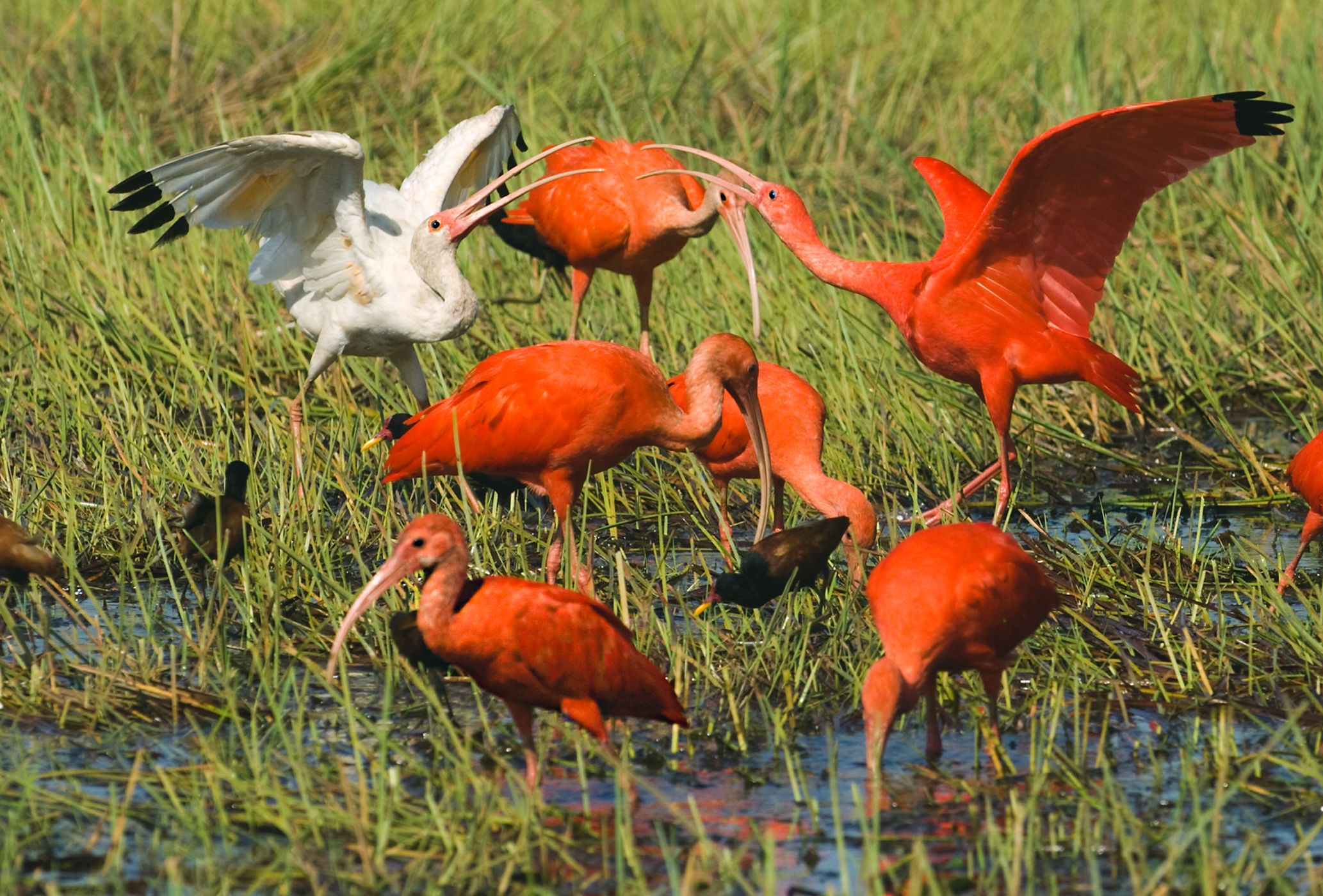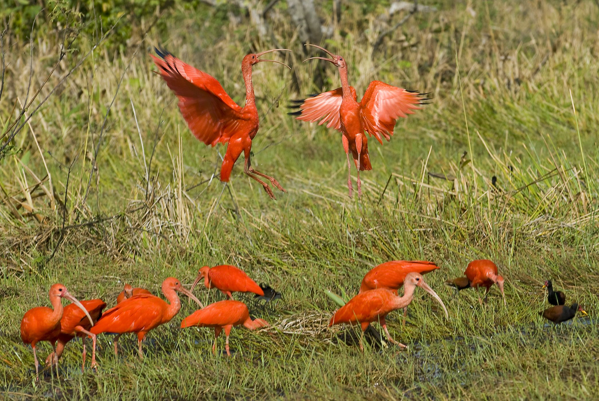 V hejnu asi třiceti rudých ibisů se pohybovali dva ibisové bílí, kteří se mezi rudou přesilou chovali úplně jako mezi svými