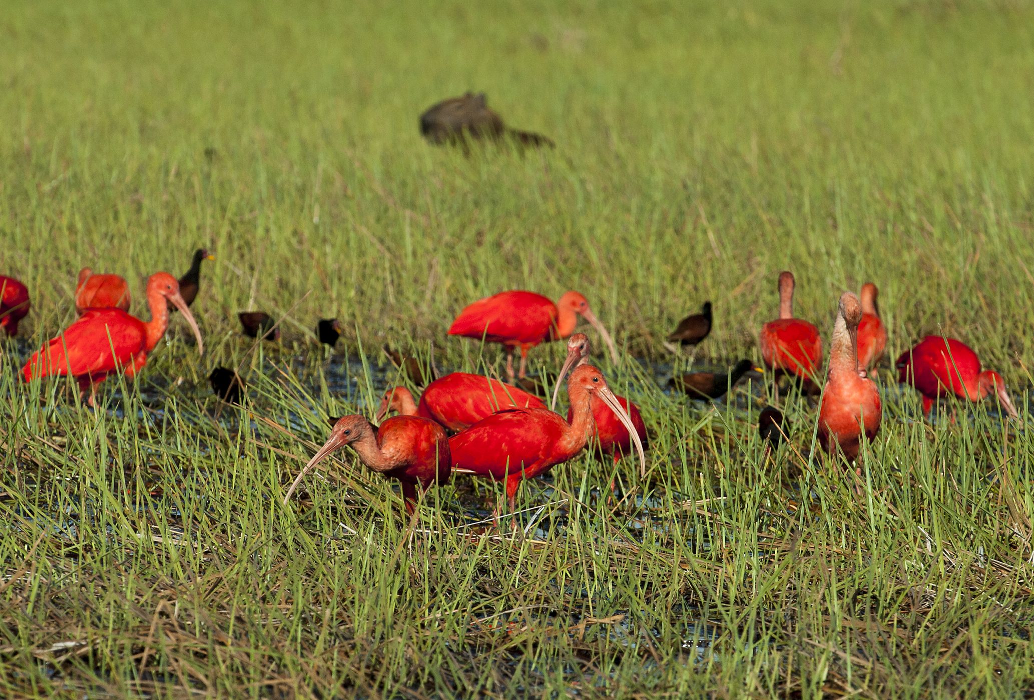 Hejnu ibisů vůbec nevadily kapybary (v pozadí ve vysoké trávě), které se pohybovaly kolem hejna