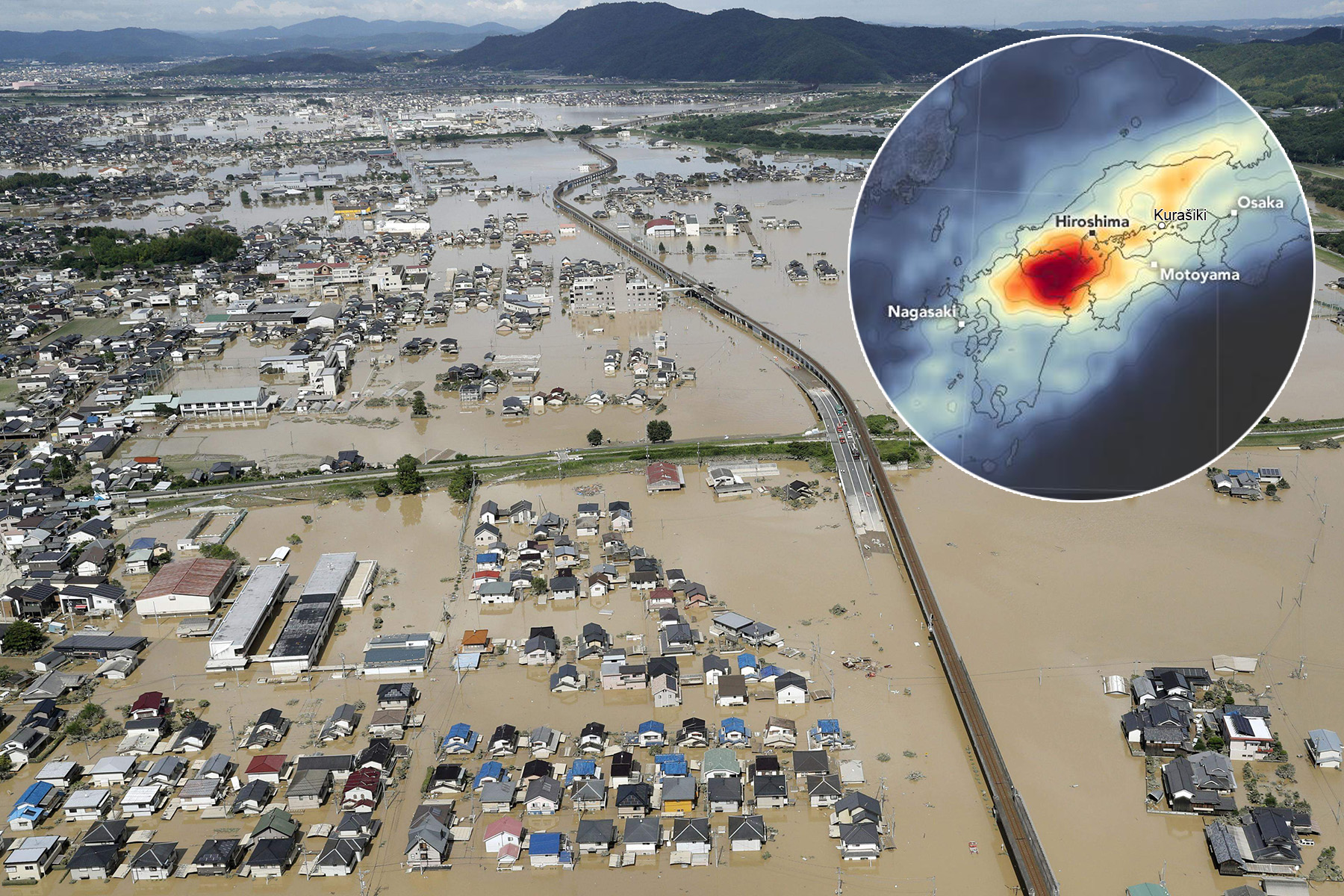 Následky prudkých dešťů v japonském městě Kurašiki v prefektuře Okajama.