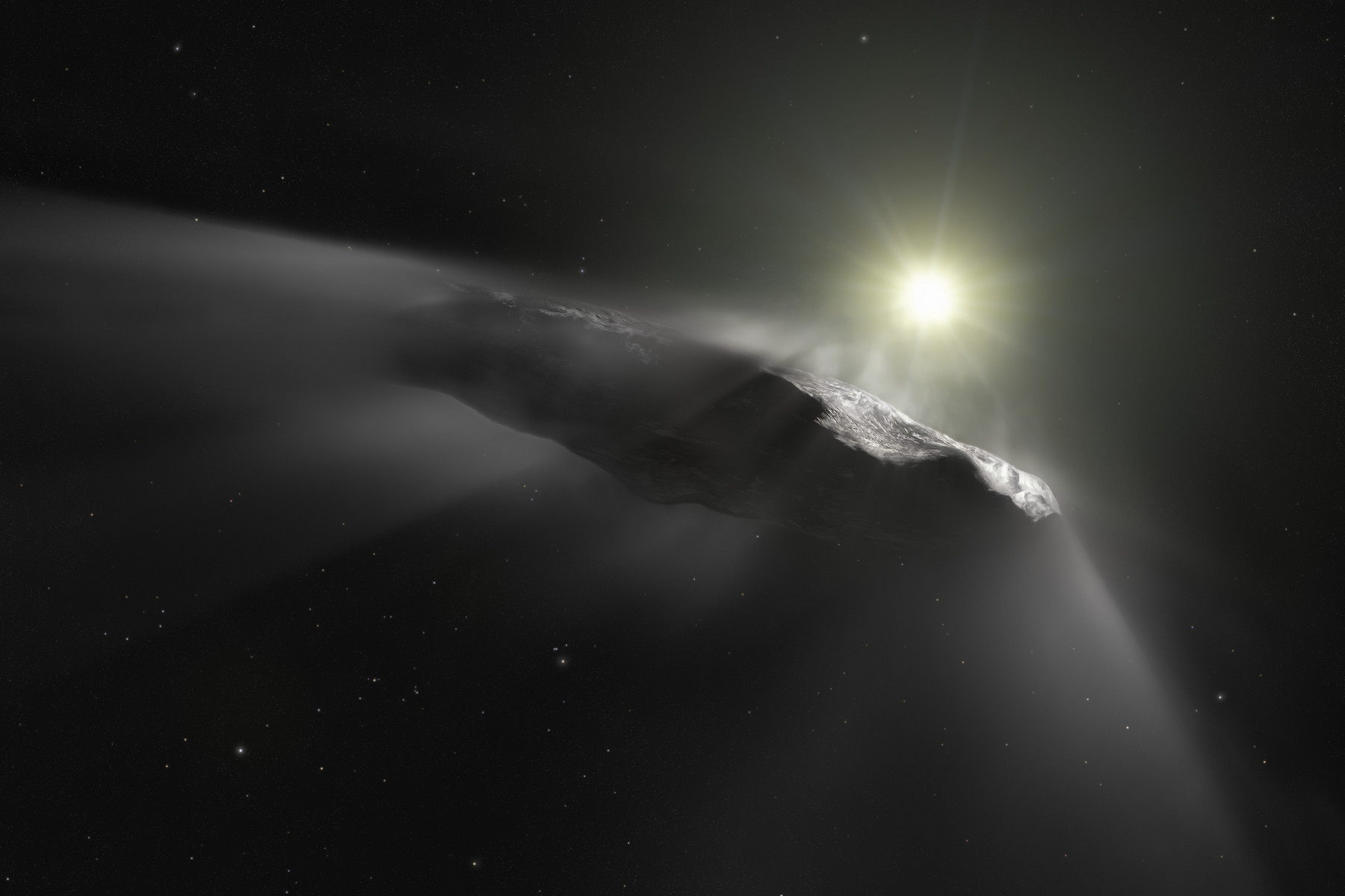 Vizualizace zachycuje první mezihvězdný objekt pojmenovaný `Oumuamua. Materiál v okolí tělesa je zobrazen jako difúzní oblak na straně přivrácené ke Slunci.