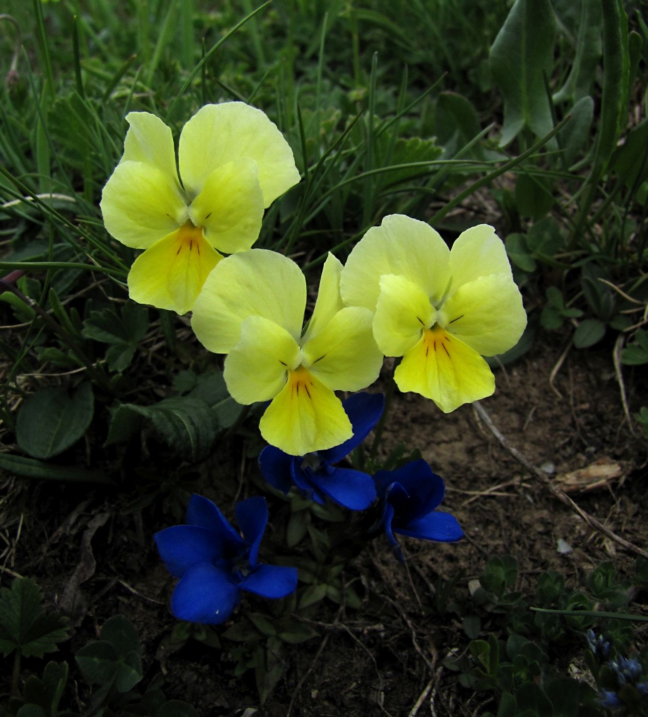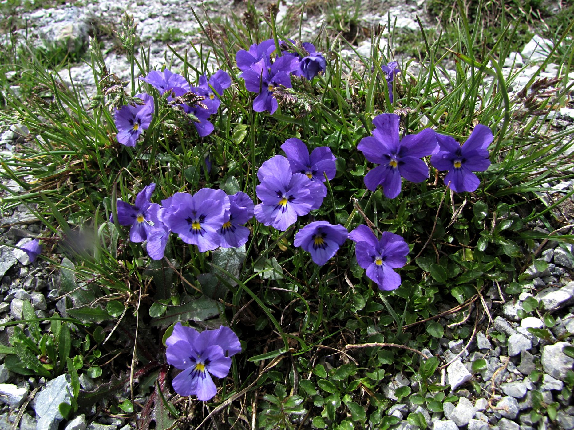 Violka ostruhatá (Viola calcarata) má řadu poddruhů. Toto je nejběžnější z nich fotografovaný poblíž Černého jezera (Schwarzsee) na svahu Matterhornu ve Švýcarsku