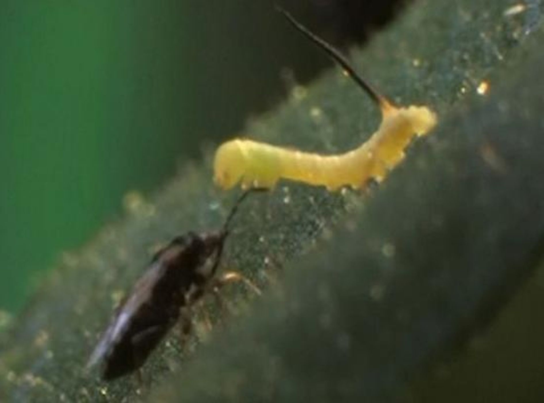 Dravá ploštička Geocornis napadá čerstvě vylíhlou housenku lišaje