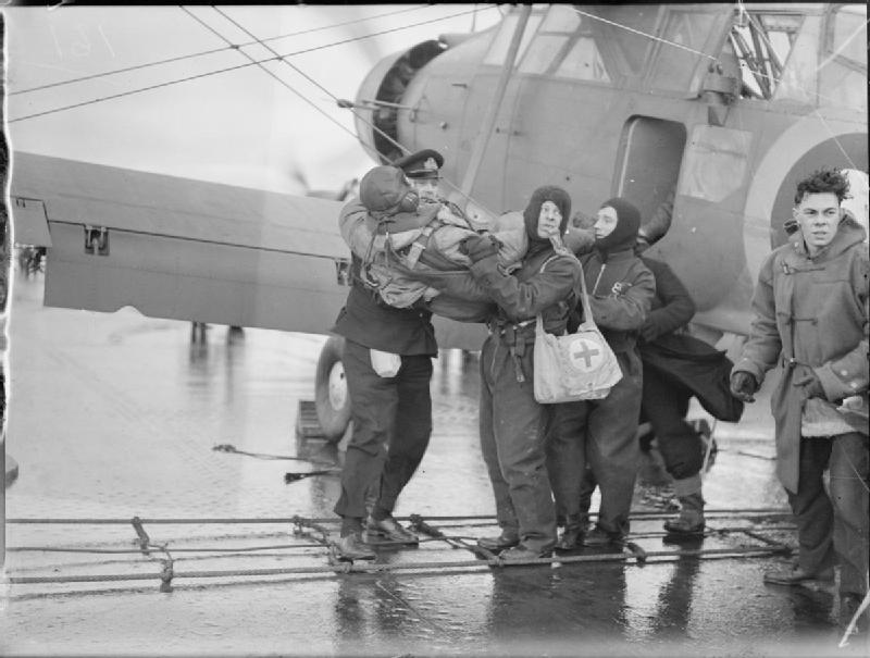 Posádka britské HMS Victorious vynáší z letadla zraněného člena osádky po jednom z neúspěšných útoku na bitevní loď Tirpitz.