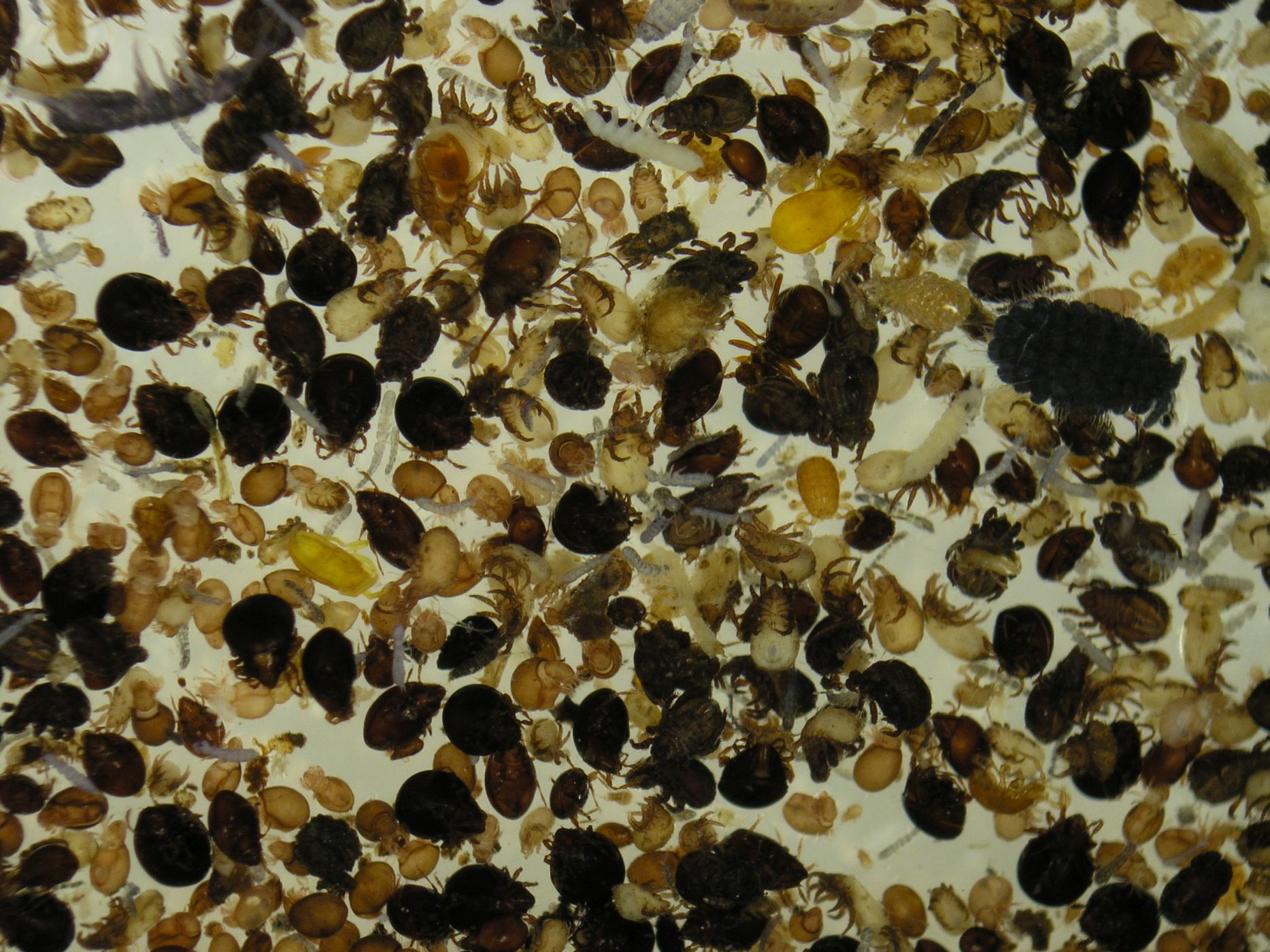 Půda je plná života, jak je vidět z tohoto vzorku drobných půdních členovců. V dobře fungující zdravé půdě jich může být i 100 000 na metr čtvereční. V degradované půdě jejich počet klesá