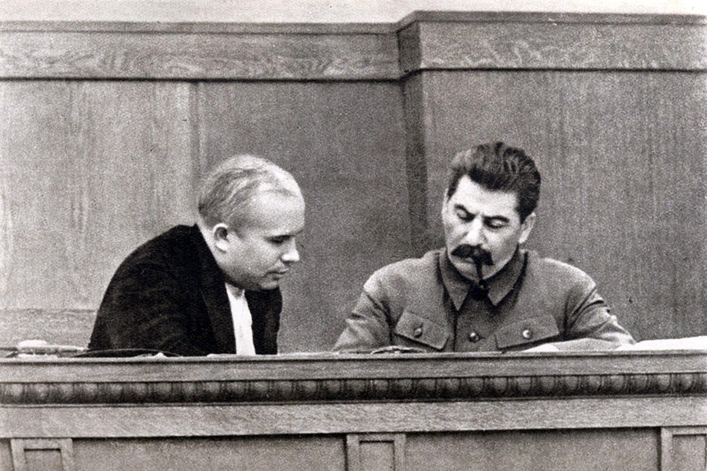 Mladý Chruščov vedle Stalina v roce 1936, dvacet let předtím, než vystoupil s kritikou Stalinova kultu osobnosti