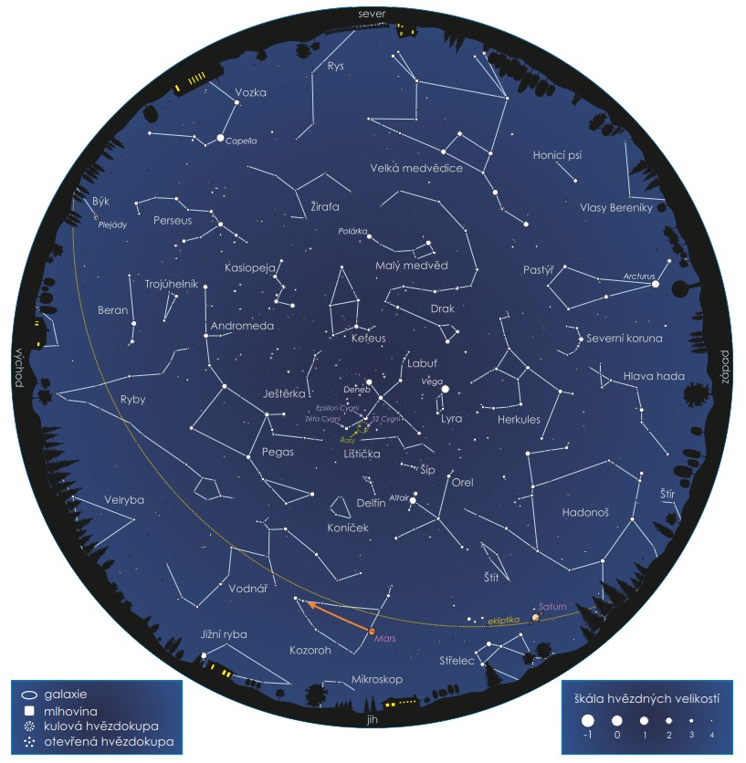 Obdélníková mapa uvádí přibližné polohy významných těles Sluneční soustavy na říjnovém nebi. U Měsíce jsou zvýrazněny pozice (včetně přesného data), v nichž nastává první čtvrt, úplněk, poslední čtvrt a nov. Pohyb Slunce, Měsíce a planet mezi souhvězdími za uvedené období naznačují křivky ve střední části mapy.