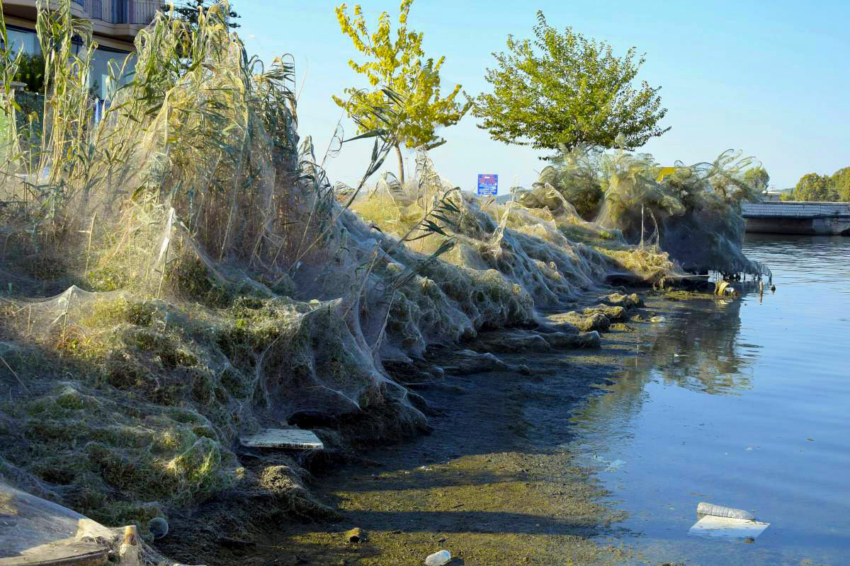 Pavoučí tsunami: Stovky metrů řeckého pobřeží přikryly husté pavučiny