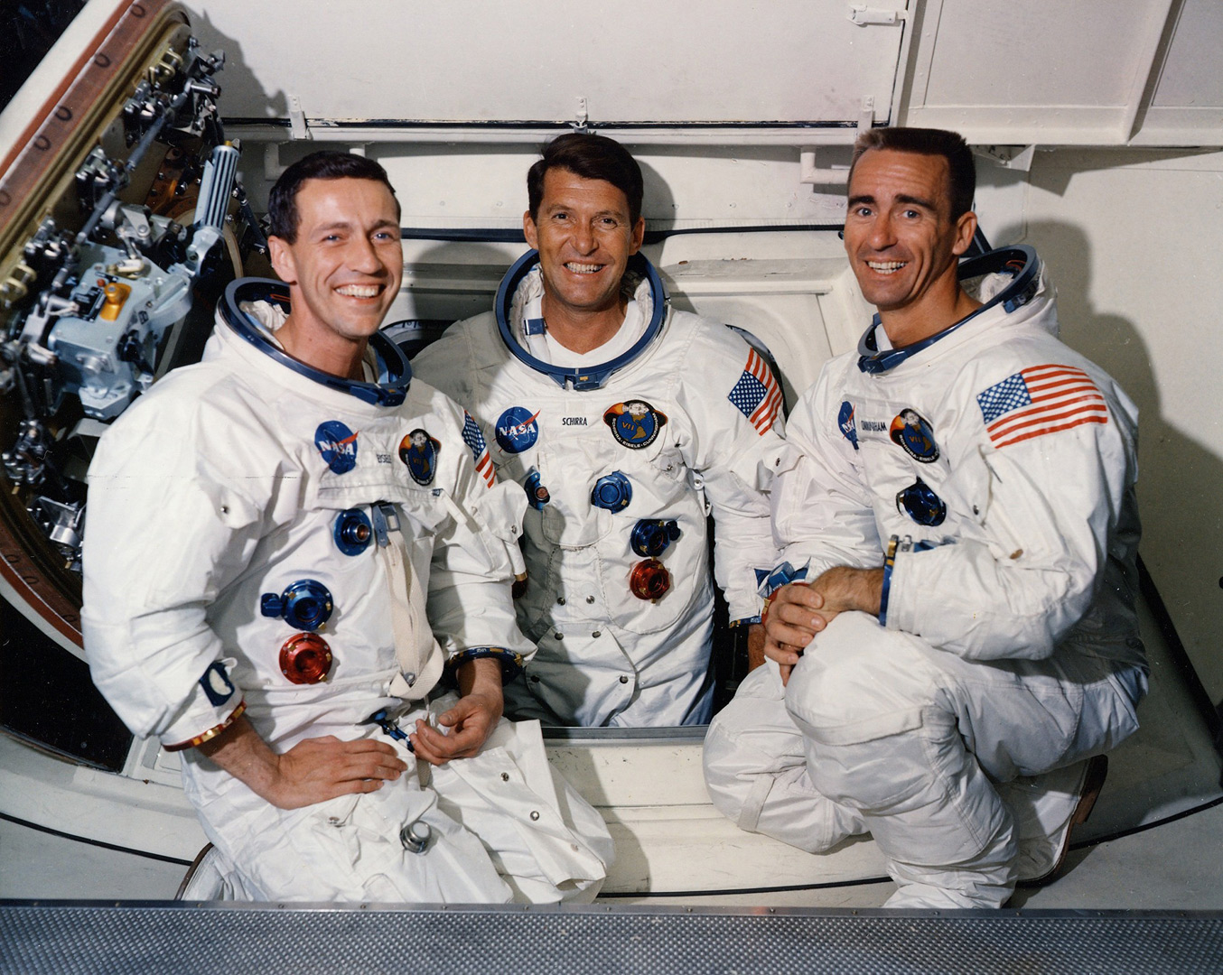 Posádka Apolla 7 ve dveřích své kabiny. Zleva Eisele, Schirra a Cunningham