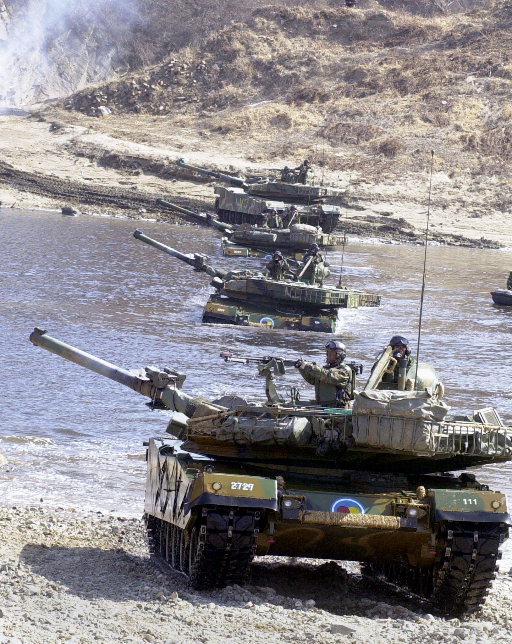Jihokorejské hlavní bojové tanky K1 ROKIT překračují řeku Hantan poblíž hranice s KLDR 25. února 2000. Stroje dokáží bez přípravy překonat vodní tok o hloubce 1,2 metru, jakmile ale osádka použije nástavec pro hluboké brodění, tank by si měl poradit až s hloubkou 4 metrů.