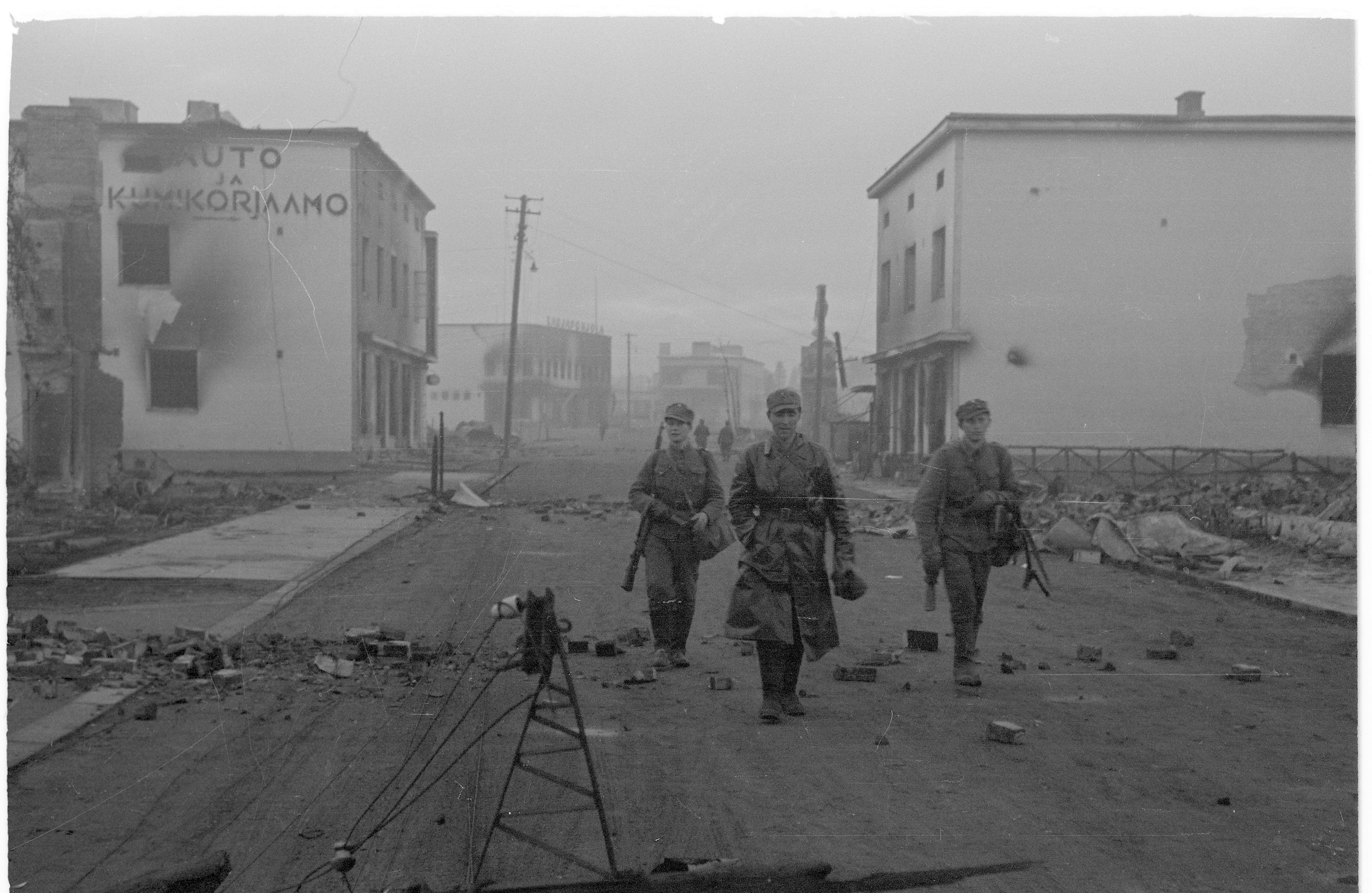 Finští vojáci ve zničeném a vypáleném Rovaniemi během laponské války.