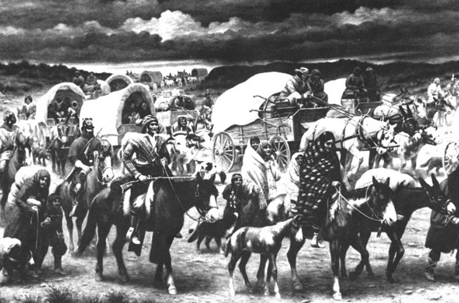 Na podzim roku 1838 se patnáct tisíc Čerokíů vydalo na více než tisícikilometrový pochod na západ, na planiny dnešní Oklahomy, kde měli v rezervaci nalézt nový domov. Tzv. slzavá stezka (Trail of Tears) však pro ně měla fatální následky. Kolonu napadali bandité a vojenský doprovod bezbranné zástupy vyhnanců nejen nechránil, ale sám se dopouštěl dalších krádeží a krutostí. Vyčerpávající cestu v chladném počasí nepřežily čtyři tisíce lidí.