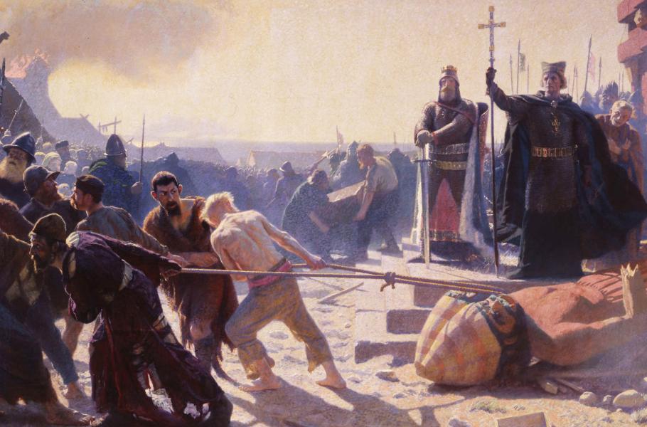 Zničení slovanské svatyně na Rujáně roku 1168 na plátně Lauritse Tuxena z druhé poloviny 19. století. Povalení Svantovítovy sochy přihlíží dánský král Valdemar a roskildský biskup Absalon.