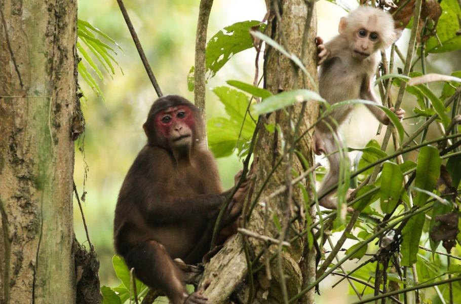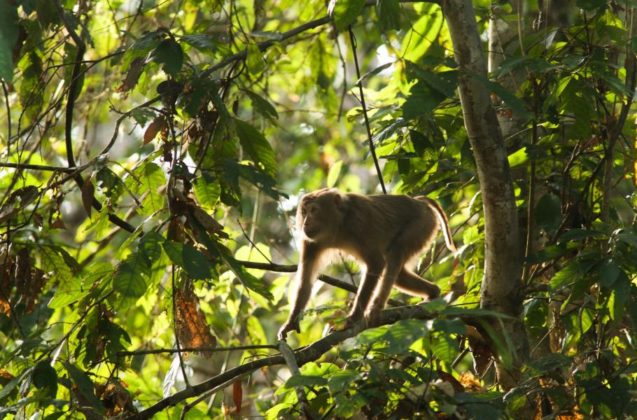 Nejprve zahlédneme samici makaka indočínského (Macaca leonina) s mládětem. Jak už jméno napovídá, má tento druh rozsáhlý areál rozšíření od Thajska a Vietnamu přes Barmu a jižní Čínu až na severovýchod Indie. V Gibbon WLS jich přežívá asi sedmdesát pět. Plížíme se po úzkých stezkách a pozorujeme, jak samice s mládětem na břiše nad námi přechází z jednoho stromu na druhý. Zastavuje se a oba se krmí ovocem.