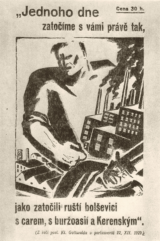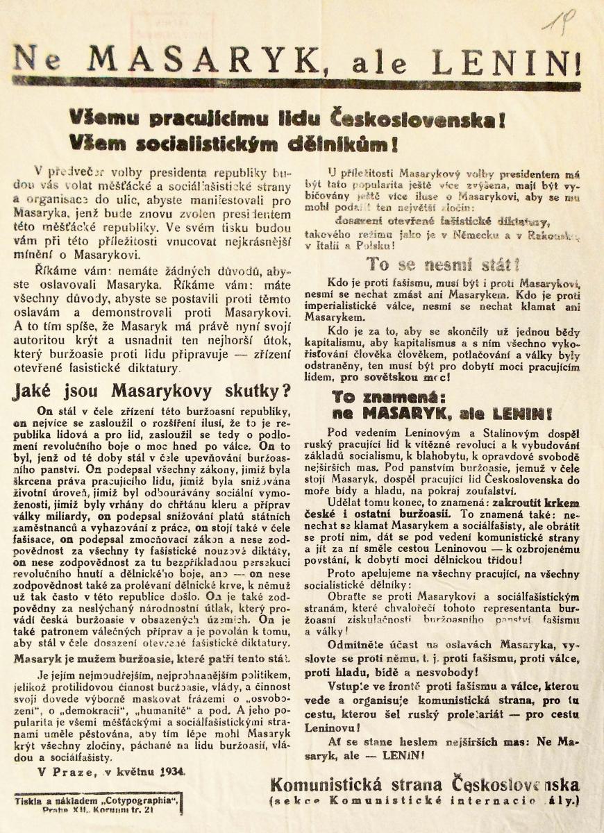 „Odmítněte účast na oslavách Masaryka, vyslovte se proti němu, tj. proti fašismu, proti válce, proti hladu, bídě a nesvobodě! Vystupte ve frontě proti fašismu a válce, kterou vede a organisuje komunistická strana, pro tu cestu, kterou šel ruský proletariát – pro cestu Leninovu! Ať se stane heslem nejširších mas: Ne Masaryk, ale – Lenin!“