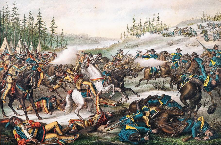 Poslední kapitola Siouxských válek se odehrála roku 1890 – ilustrace zachycuje smrt náčelníka Sedícího býka. (ilustrace: Wikimedia Commons, Kurz & Allison, PDM 1.0)