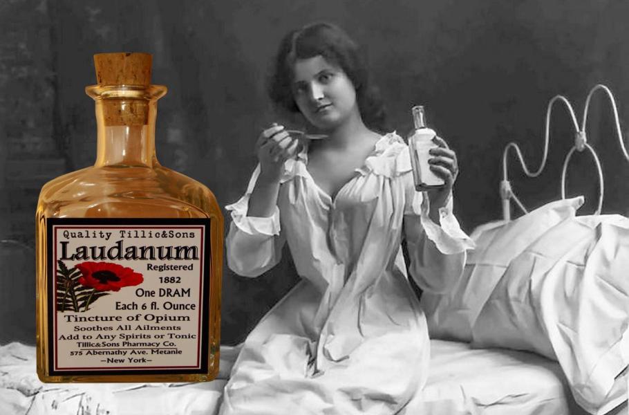 Laudanum neboli desetiprocentní alkoholový roztok opia má typickou hnědavou barvu a hořkou chuť. Užívalo se v první polovině 19. století. Obsahovalo několik opiových alkaloidů včetně morfinu a kodeinu. Pacienti jej brali prakticky na vše od kašle, nachlazení a bolestí po dětské nemoci, depresi i astma. Velkou oblibu mělo laudanum u žen, kterým mělo ulevovat od menstruačních bolestí a tišit zlobivé děti. Nikdo neměl tušení, že je silně návykové. Bylo snadno dostupné v běžných obchodech za relativně nízkou cenu. Snad i kvůli tomu se brzy stalo „vylepšovačem“ nálady umělců i dalších lidí. Teprve po několika desítkách let a mnoha úmrtí na předávkování se začalo proslýchat, že se slavným laudanem není něco v pořádku, a začala se hledat adekvátní náhrada. (foto: Wikimedia Commons, CC0)