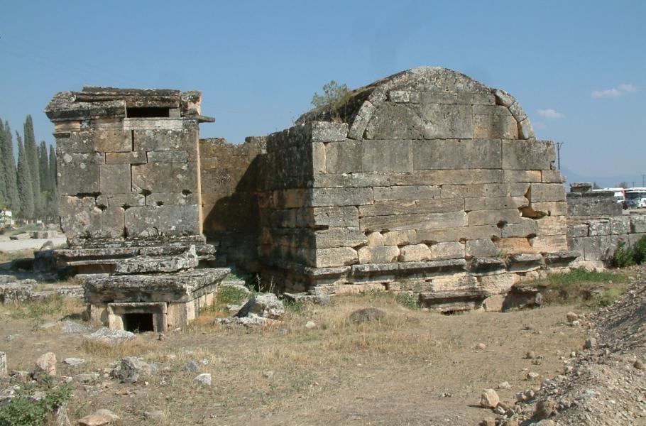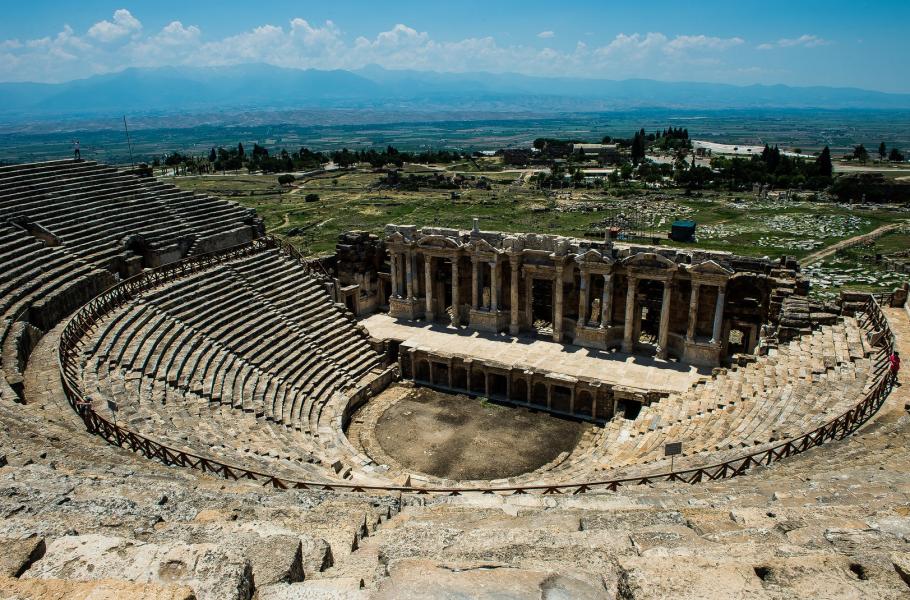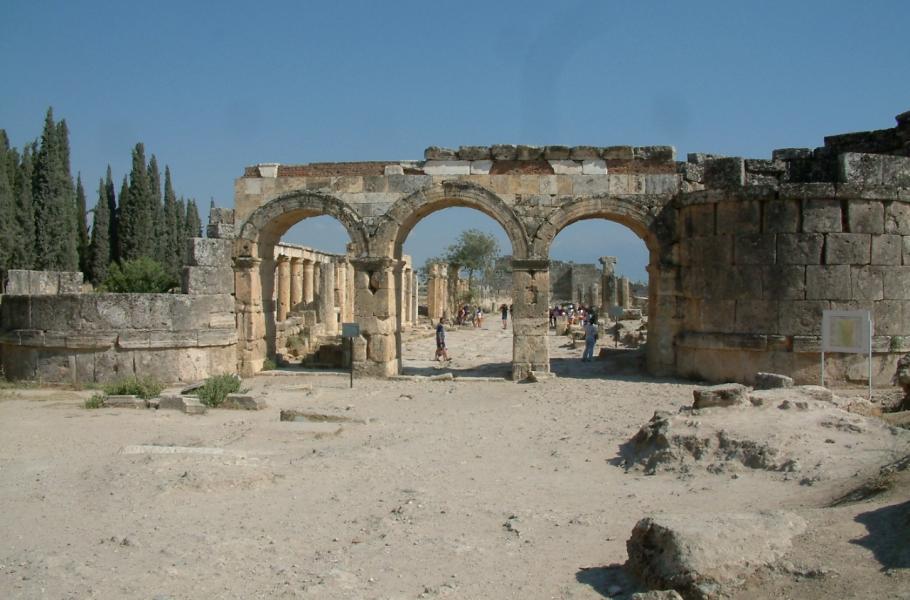 Na náhorní plošině v těsném sousedství vápencových teras nechal ve 2. století př. n. l. král Eumenes II., vládce maloasijského Pergamonu, vystavět město Hierapolis. V době největšího rozkvětu zde žilo sto tisíc lidí a sídlo se záhy proslavilo termálními prameny, do nichž se přijel ohřát dokonce samotný císař Caracalla. Známé lázně ale během staletí několikrát poničilo zemětřesení, až nakonec zůstalo město ve 14. století opuštěné. Dnešní návštěvníky nejvíce zaujme Domitianova brána, nekropole s 1 200 hroby či amfiteátr.