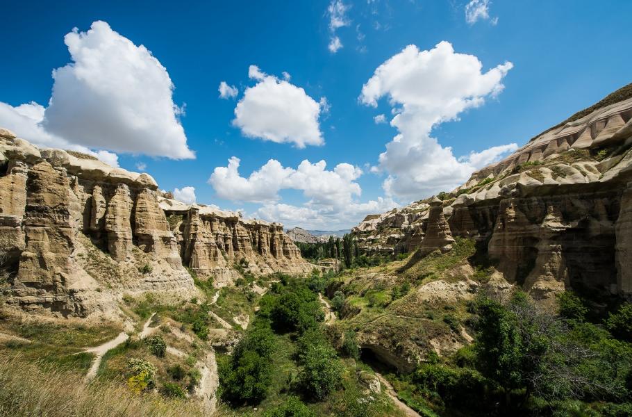 „Pamukkale“ znamená v překladu bavlněný hrad a vytvořila jej už před čtrnácti tisíci lety teplá minerální voda, ve které se sráží minerály, především uhličitan vápenatý. Vznikl tak oslnivě bílý, pórovitý a křehký travertin, jenž horké prameny přehradil, přičemž se zrodily desítky jezírek a kaskád.