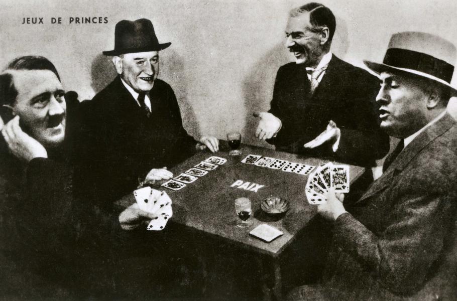 Karikaturisticky znázorněná mnichovská konference, která Německu mírovou cestou získala Sudety. Představitelé evropských mocností „hrají o mír“, povšimněte si es v Hitlerově ruce. (foto: Profimedia)