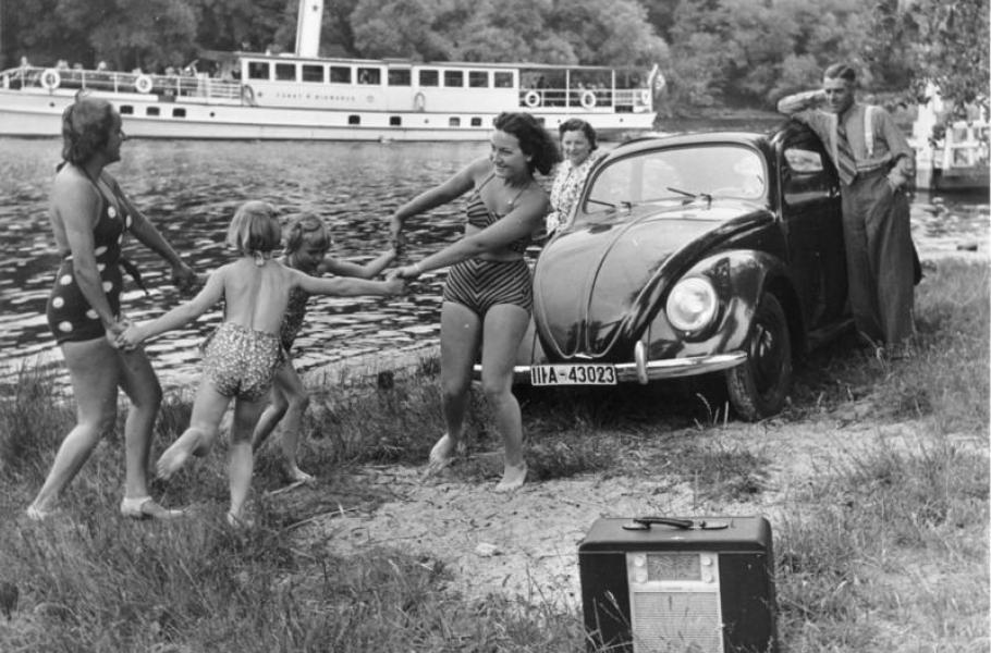 V pozadí lidový vůz KdF (Volkswagen), který si měl mít možnost pořídit téměř každý pracující občan