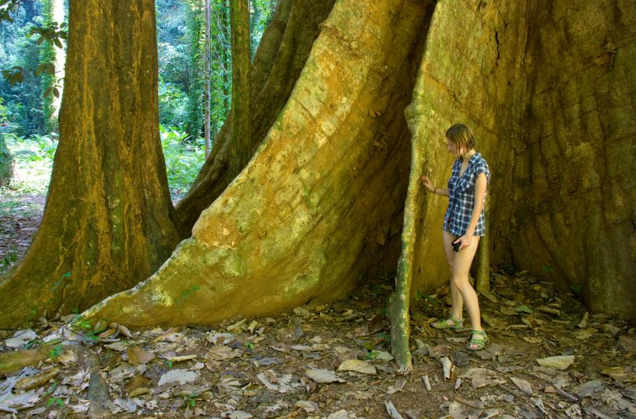 Z Ko Du míříme na o něco větší ostrov, kde se i na chvíli vydáváme do džungle. Na ostrovech máme možnost rozlišit dva základní typy lesa – na menších ostrůvcích s mělčími půdami rostou spíše křoviny, zatímco velké ostrovy pokrývá stálezelený les. V něm nás nejvíc přitahují stromy s obrovskými deskovými kořeny, které z kmene vyrůstají i několik metrů nad zemí. Pravděpodobně vznikly jako adaptace na velký obsah vody v půdě. Z jiných druhů se zase jako provazce spouštějí vzdušné kořeny, které umožňují zachytávat vlhkost z ovzduší.