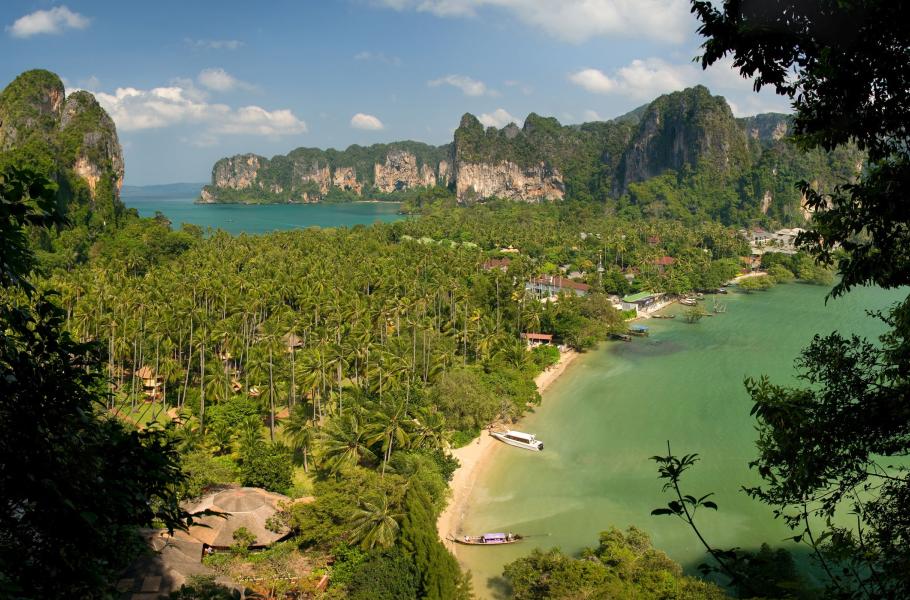 Našim dalším cílem je poloostrov Railay nedaleko města Krabi. Jeho západní okraj je díky okolním scenériím se skalními věžemi považován za jednu z vůbec nejkrásnějších thajských pláží. Celou oblast mají v mimořádné oblibě lezci, na které zde čeká několik stovek vertikálních cest různé obtížnosti. V dnešní době je ale poloostrov zaplněn množstvím resortů a jeho pláž je přelidněná. Přitom je region dostupný pouze po moři.