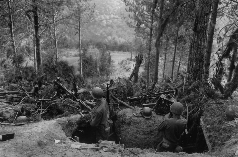 Američtí pěšáci v jednom z obsazených německých kulometných hnízd. (foto: Wikimedia Commons, PDM 1.0)