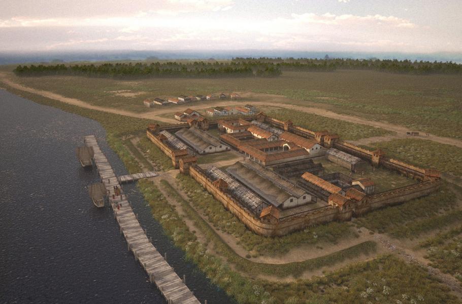Rekonstrukce římského vojenského tábora na břehu Rýna – v pozadí je vidět civilní zástavba. (ilustrace: Wikimedia Commons, Stevie Heru, CC BY 4.0)