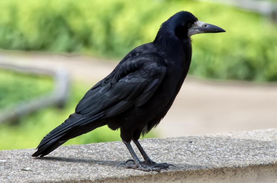 Starší havrany poznáte podle olysalého kořene zobáku; mladší mají kořen zobanu plně opeřen. Peří na nohou havranům mírně odstává a tvoří slušivé „kalhotky“. (foto: Wikimedia Commons, Mark Winterbourne, CC BY 2.0)