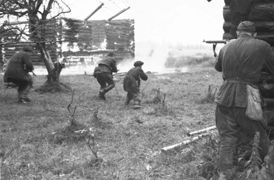 Sovětští partyzáni postupují hořící vesnicí. Podobnou skupinu kolem sebe zformoval také Omelčenko.