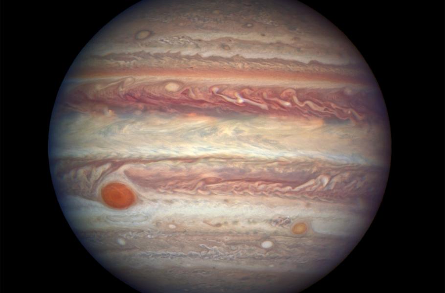 Nejnovější snímek planety Jupiter pořídil Hubbleův vesmírný teleskop na počátku dubna, kdy se tato obří planeta nacházela ve vzdálenosti 670 miliónů kilometrů od Země. Hubbleův kosmický teleskop odhalil spletité detaily nádherné oblačnosti Jupiteru uspořádané do pásů v rozdílných šířkách planety. Tyto pásy jsou vytvářeny vzdušnými proudy, které vanou odlišným směrem v jednotlivých planetárních šířkách. Světle zbarvené oblasti – tzv. zóny – jsou oblasti vysokého tlaku, kde atmosféra vystupuje výše. Tmavší oblasti nízkého tlaku, kde vzduch naopak klesá dolů, jsou označovány jako pásy.