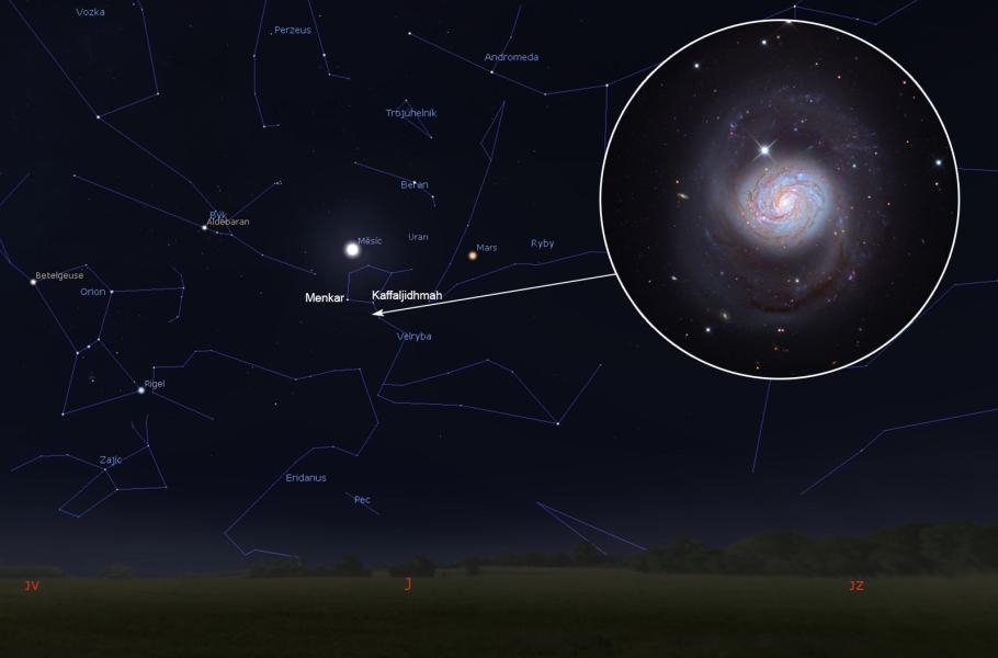 Za nenápadnost galexie M77 může obrovská vzdálenost, jež nás od ní dělí - zhruba 47 milionů světelných let. Jde tak o jeden z nejodlehlejších objektů Messierova katalogu. Na snímku její pozice 25. prosince okolo 20. hodiny.