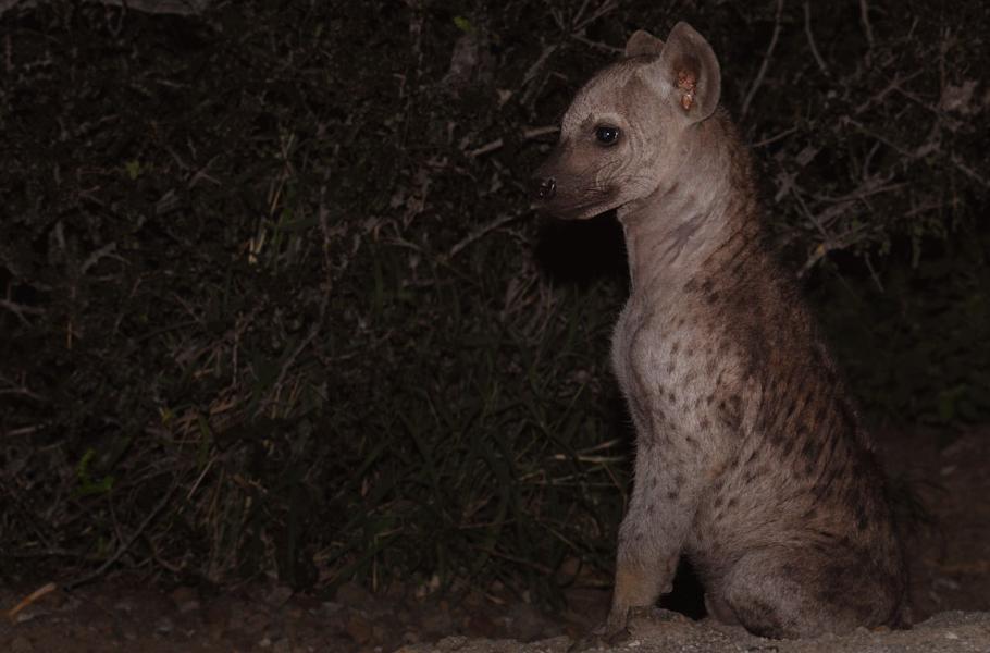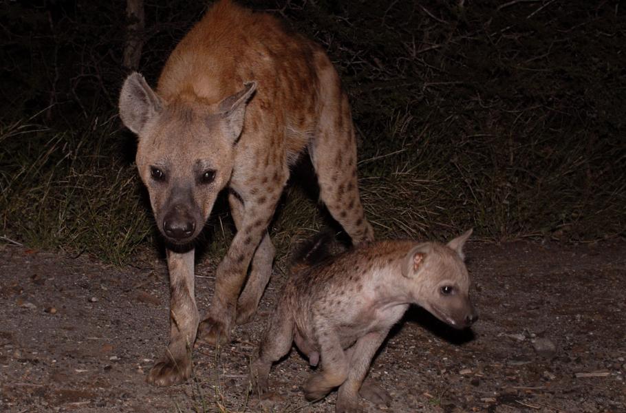Míjím hodně zarostlý úsek a kromě dvou slonů a několika ustrašených impal nevidím žádnou zvěř. Cesta se zužuje a já začínám být trochu zklamaný z okolní krajiny. V hustě rostoucí zeleni nemám šanci spatřit žádnou kočku, kterou vždy na závěr dne toužebně vyhledávám… Najednou se v hluboké příkopě pohne černý stín. Málem jsem jej přehlédl a musím zařadit zpátečku, abych se přesvědčil, zda mne jen neklamal zrak. Možná to byla jen cibetka nebo pár veverek, které se vyděšeně přikrčily před projíždějícím automobilem. Třeba mám z celodenního hledění do neznáma mžitky před očima a za každým pařezem, kamenem a rozpadlým termitištěm vidím predátora. Nakloním se z auta a snažím se něco spatřit v hluboké noře mizící pod cestou. Najednou z ní vystrčí hlavu hyena a po chvilce nejistoty se uloží do špinavého prachu vedle pelechu. Pak dostane odvahu i několikatýdenní štěně, které se s chutí vrhne matce na břicho a začne hltavě sát mléko.
