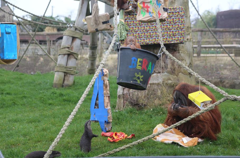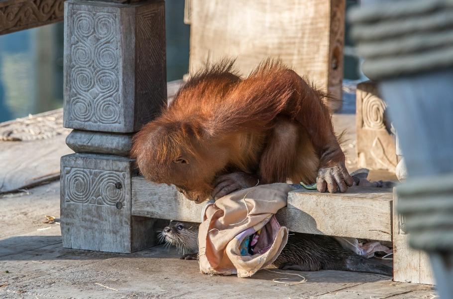 Podle mluvčího zoo Mathie Goedefroye vydry rády vylézají z vody a chodí na orangutanní ostrůvek, aby si hrály se svými velkými chlupatými kamarády.
