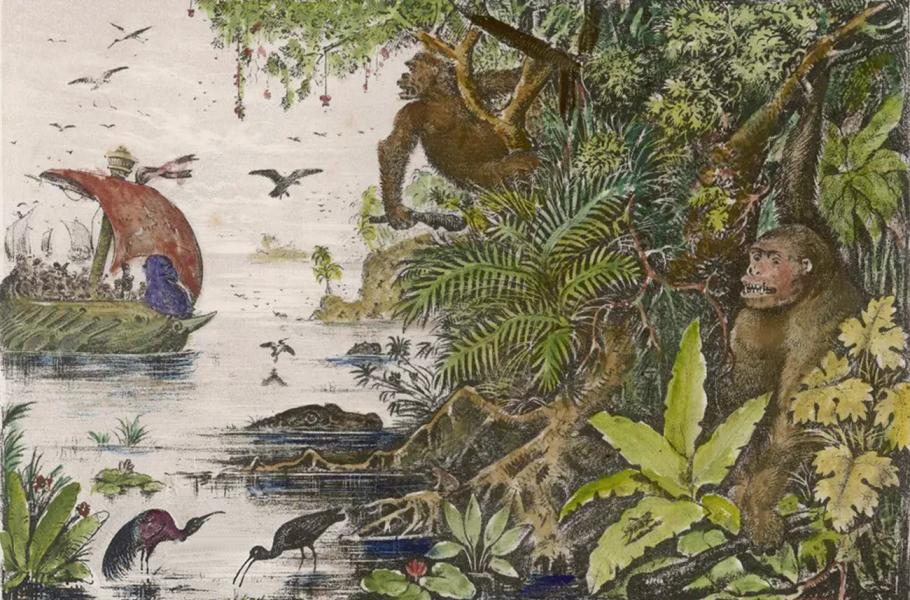 Setkání Hannovy výpravy s gorilami na uměleckém ztvárnění od W. P. Bennetta. (ilustrace: Shutterstock)