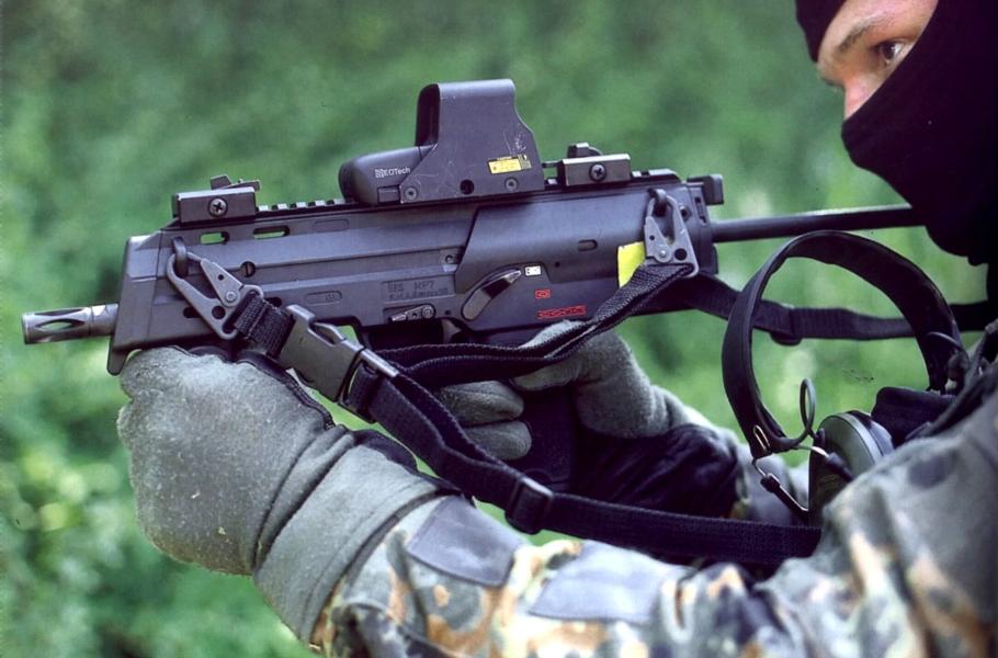 Patrně nejznámějším a nejpopulárnějším typem, jenž reprezentuje toto pojetí, je puška P90 od belgické zbrojovky FN, která pro ni zkonstruovala střelivo ráže 5,7 mm. Stranou ovšem nemohl zůstat ani další z velkých „hráčů“ na trhu automatických zbraní, již zmíněná německá značka Heckler & Koch. Její zkušení odborníci dobře věděli, že nejdříve se konstruuje náboj, a teprve po něm přijde na řadu samotná zbraň.