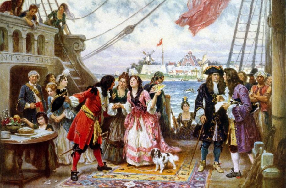 Kapitán William Kidd vítá mladou ženu na palubě své lodi. (ilustrace: Wikimedia Commons, Jean Leon Gerome Ferris, PDM 1.0)