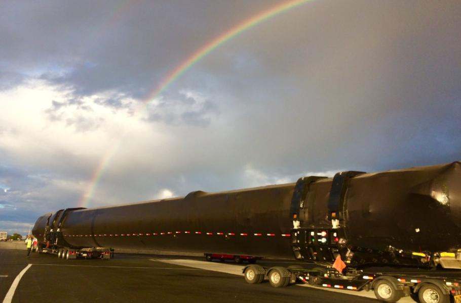 První stupeň rakety Falcon 9 během přesunu z testovacího střediska McGregor na Vandenbergovu leteckou základnu.