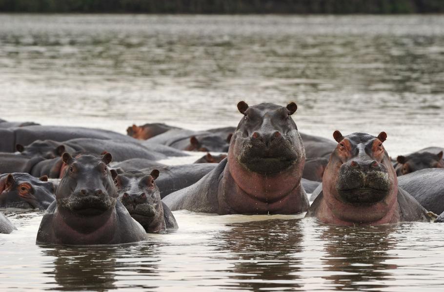 Když hroch hrozí, dokořán otevře tlamu. Tato pozice na fotografii už znamená stupeň nejvyššího varování. Vzápětí na to následuje útok...